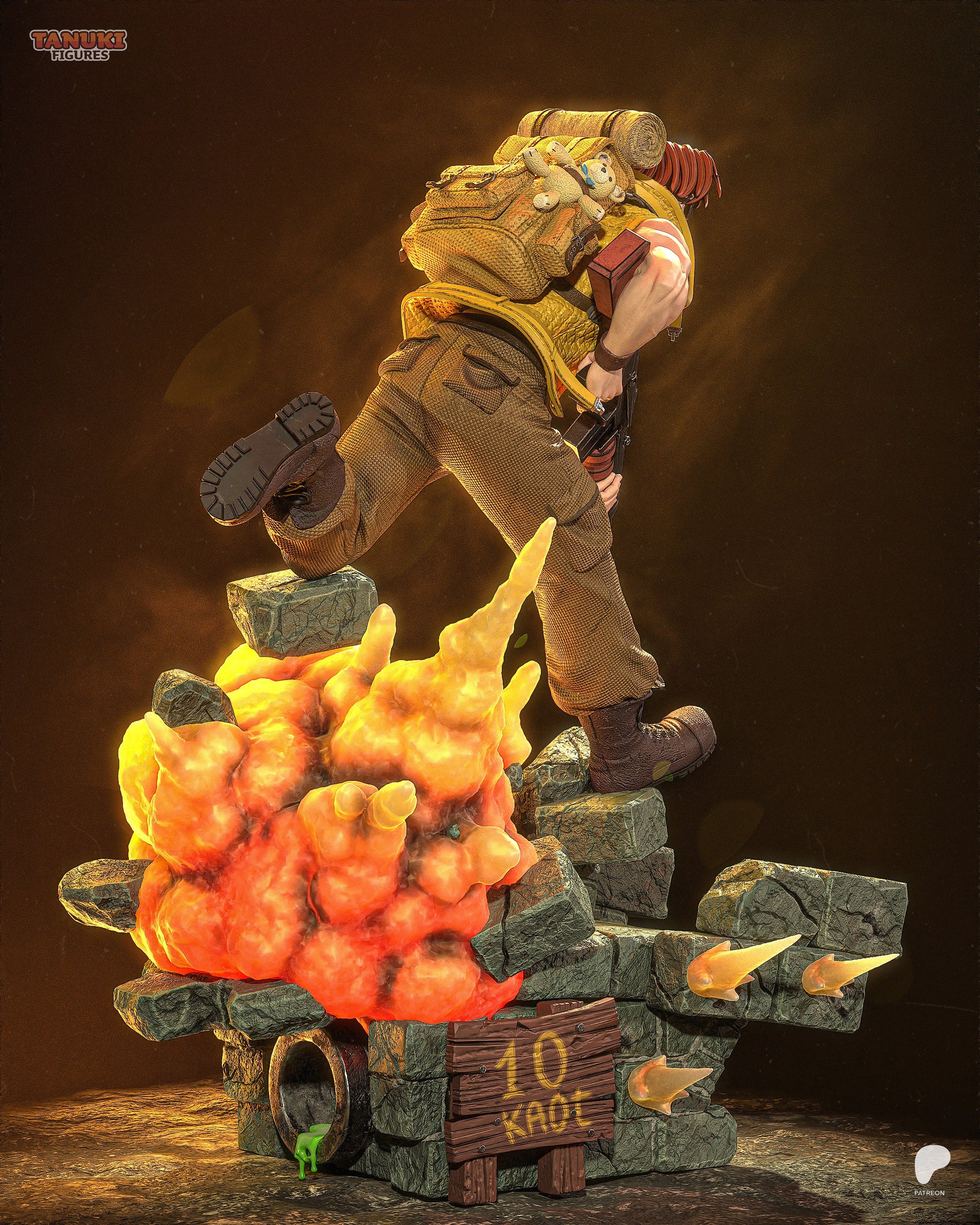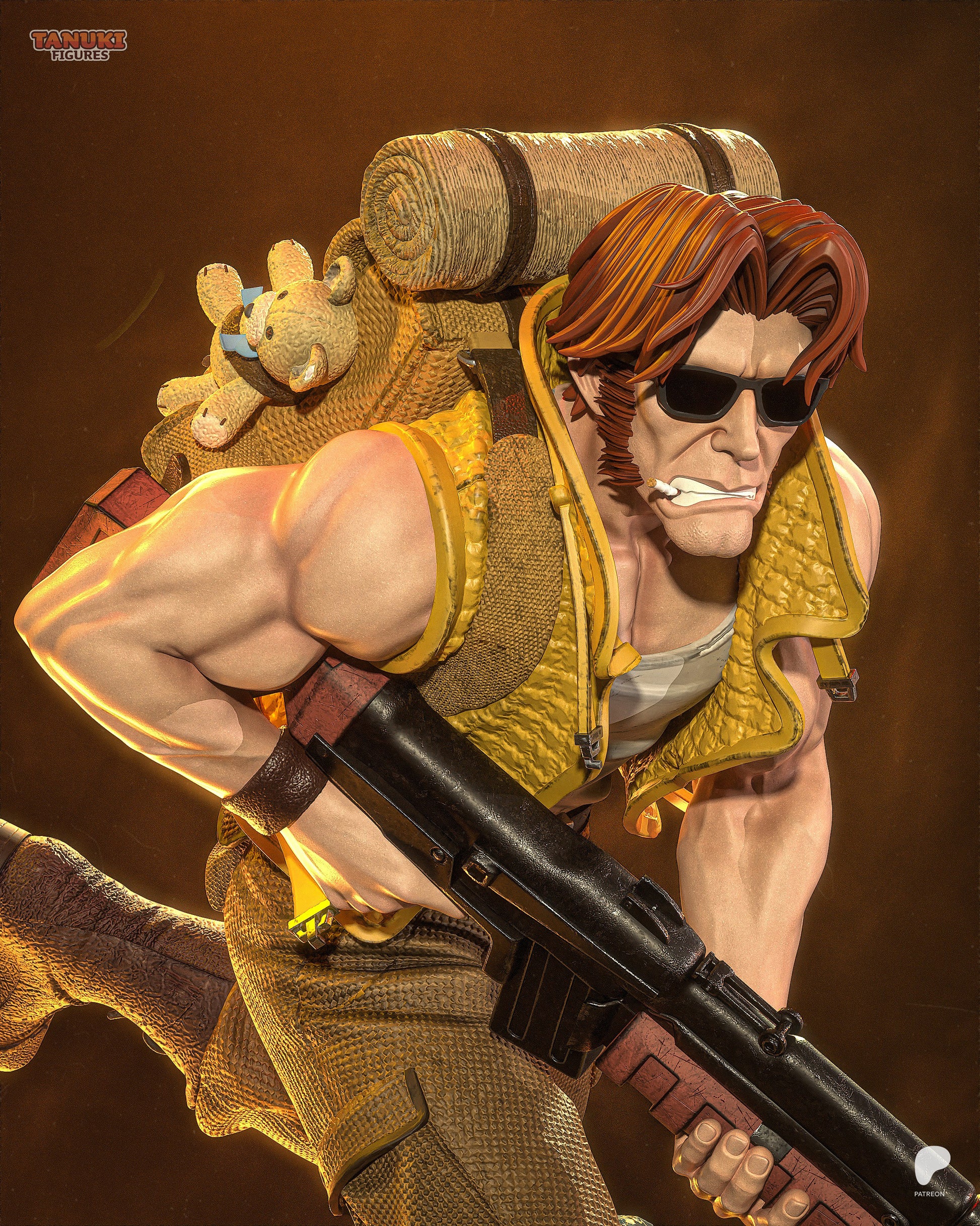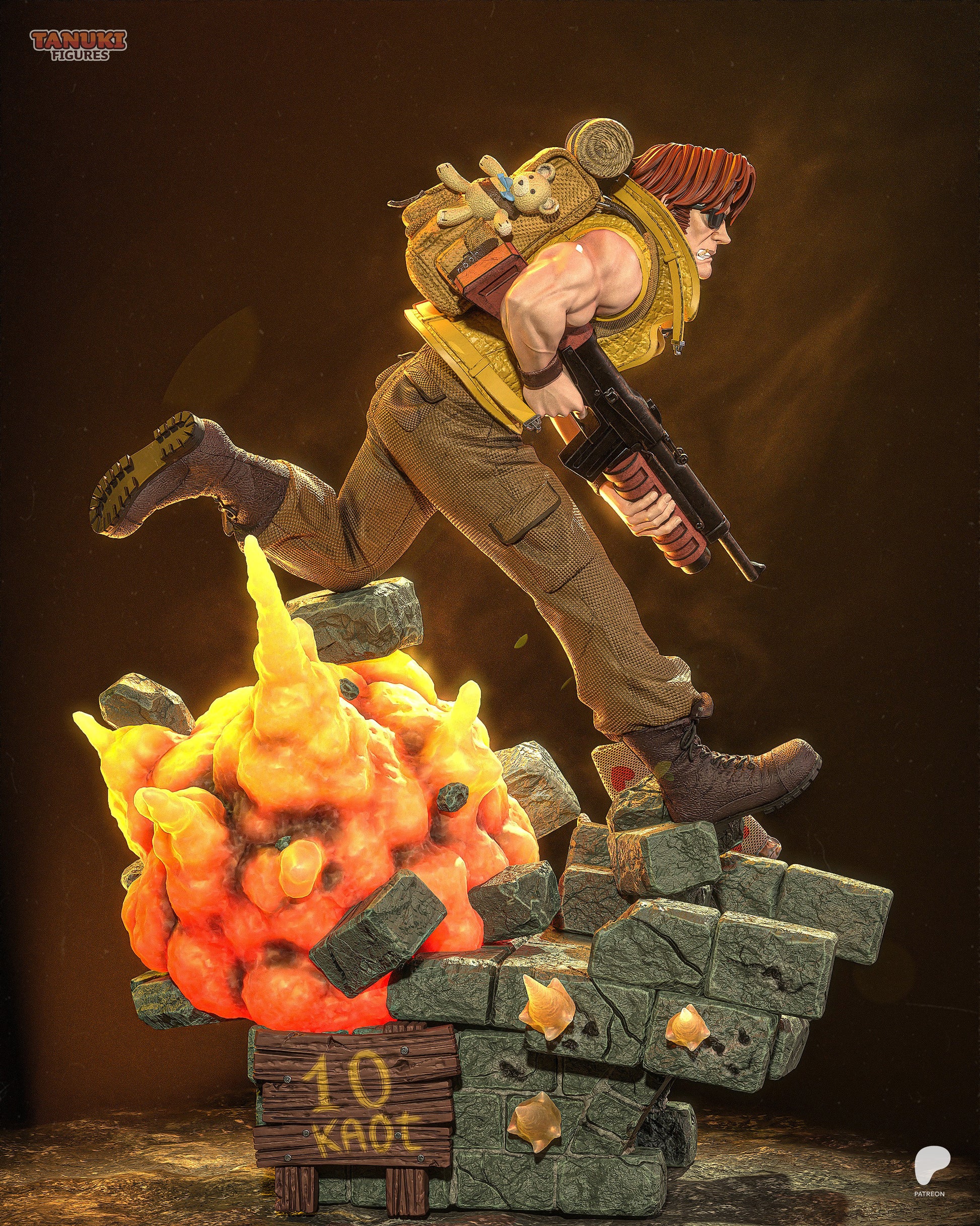Tarma Roving, the motorcycle-riding, calm-and-collected co-founder of the Peregrine Falcon Squad, is the epitome of cool in the middle of chaos. Whether mowing down waves of enemies or charging into battle with his trademark shades, Tarma is a Metal Slug legend. This sculpt captures him mid-stride — gun in hand, explosions at his back, and a little stuffed bunny peeking from his pack as the ultimate wink to fans of SNK’s classic run-and-gun mayhem.